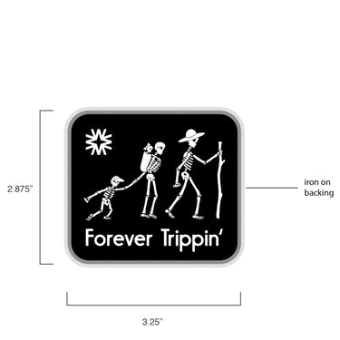 We have always been huge fans of all things spooky, especially skeletons. Our other favorite things are family and travel. So what do you get when you combine all of those? Forever Trippin’. This patch was designed for those families who will be road trippin’ til the end of time... and then some! *backside = iron on adhesive